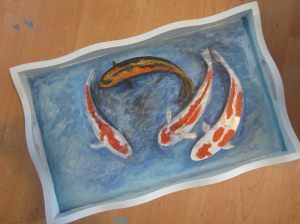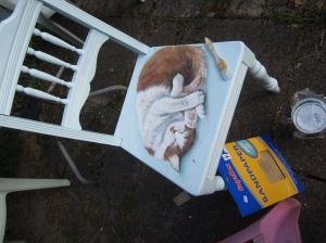 I’ve also been painting some “Trompe L’oeil” objects. Decorating and reclaiming something that might otherwise have had no value, that might have been overlooked or thrown away. These are very different from my landscape painting in many ways. When I paint landscapes, I try to capture mood, light, tone and a general feeling of the day. When I paint Trompe L’oeil, it is all about the challenge of painting something that will make someone look twice at an object, surprise them and make them smile. It’s all about trying to paint as realistically as possible. My attempts at this can been seen below with my cat chair and fish tray: