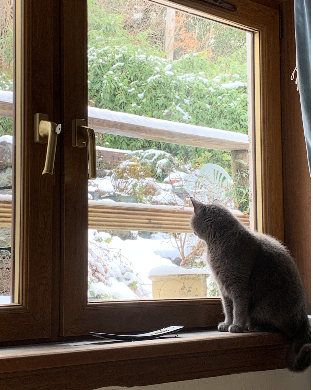 I’m currently sitting in bed in my spare room as there is a good view of the garden, and I’m tired because I cleaned the bathroom after my morning shower (just a quick wipe down, don’t tell my husband!) I’m resting, admiring the snow and being kept company by my cat