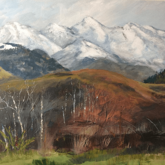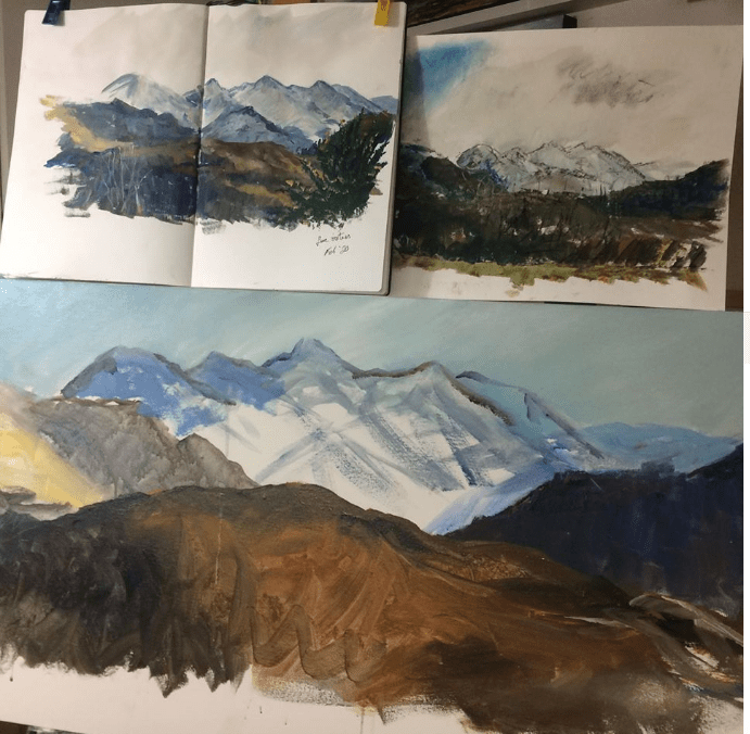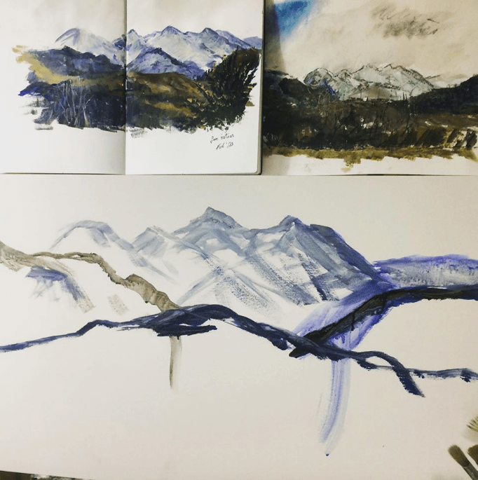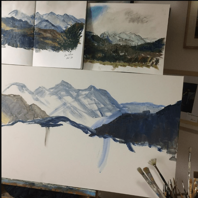 Next we had a conversation about canvas size and composition. We wanted to keep some of the immediacy and energy of the first sketch while making the mountains themselves the focus of the painting.