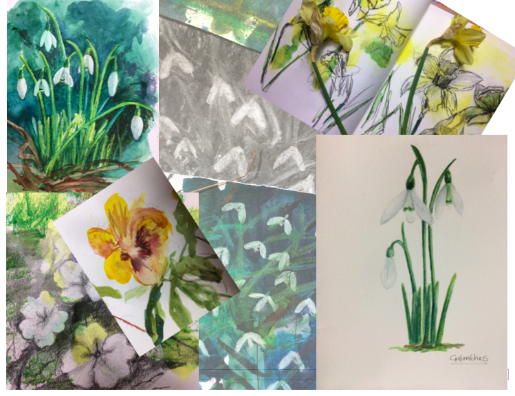Recently I’ve been back in the studio again and drawing and sketching outside too (see the sketches below). Looking more closely at how things grow, at the way they change and develop and trying to capture the intricacy of petal and leaf structure, colour and stem.